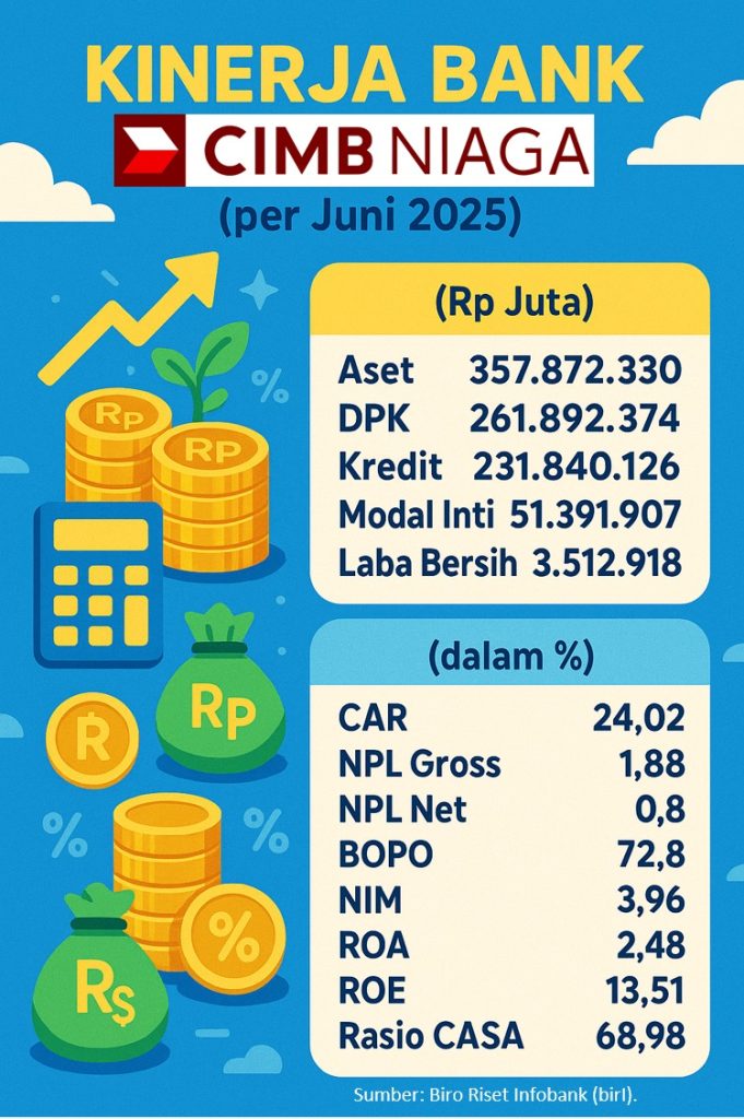 Secara total, aset Bank CIMB Niaga per Juni 2025 mencapai Rp357,87 triliun, naik 3,22 persen dibandingkan tahun sebelumnya. Penguatan struktur permodalan juga menjadi fondasi penting dalam menjaga kinerja bank.