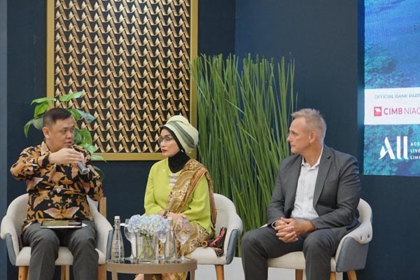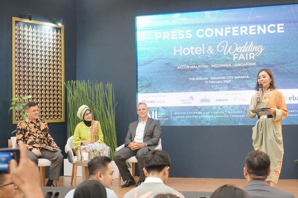 Head of Segment & Retail Product CIMB Niaga Noviady Wahyudi (kedua kanan) bersama Deputi Pemasaran Pariwisata dan Ekonomi Kreatif, Badan Pariwisata dan Ekonomi Kreatif RI Nia Niscaya (kedua kiri), Chief Operating Officer Accor Malaysia, Indonesia, Singapore & South Asia Garth Simmons (kiri), CEO & Co-Founder Ternakopi Kaesang Pangarep (tengah) dan Vice President Sales Marketing Distribution & Loyality Accor Singapore, Indonesia dan Malaysia Adi Satria (kanan) di sela konferensi pers pengenalan ALL – Accor Live Limitless pada Hotel & Wedding Fair di Jakarta, Rabu 12 Februari 2020. CIMB Niaga menyuguhkan solusi pembayaran termasuk cashback sampai Rp10 juta dan rencana cicilan tanpa bunga untuk acara pernikahan dan acara sosial lainnya.