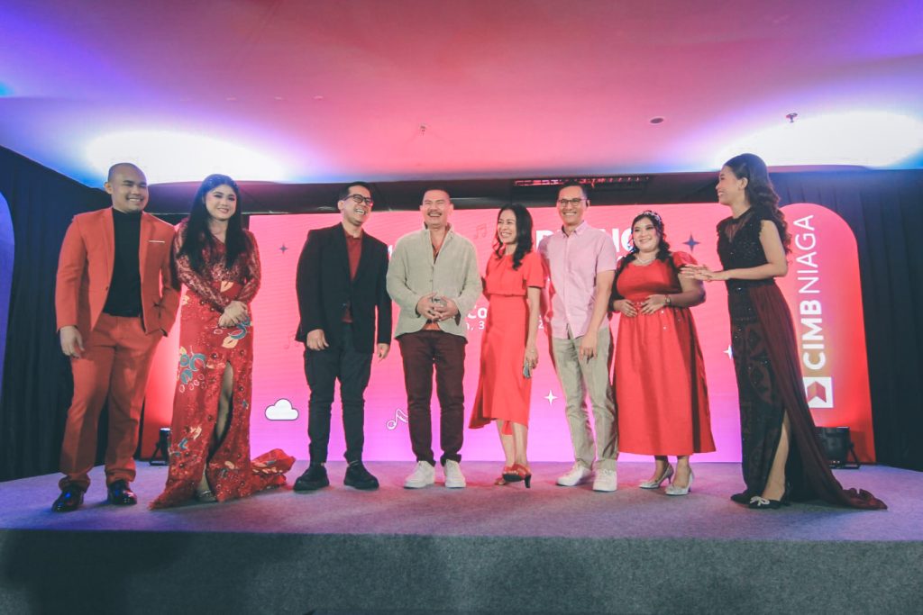 Head of Marketing, Brand and Customer Experience CIMB Niaga Muhamad Firdaus Andjar (keempat kiri) bersama Group Chief Brand & Marketing Officer CIMB Group Toni Darusman (ketiga kanan), Penyanyi Dee Lestari (keempat kanan), Music Arranger & Director Andi Rianto (ketiga kiri) dan empat pemenang Kejar Mimpi Rising Start 2024 usai Press Conference pengumuman pemenang Kejar Mimpi Rising Start 2024 di Jakarta, Rabu 31 Juli 2024/Erman Subekti