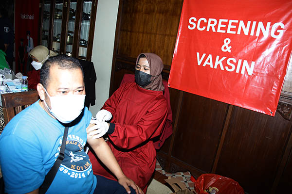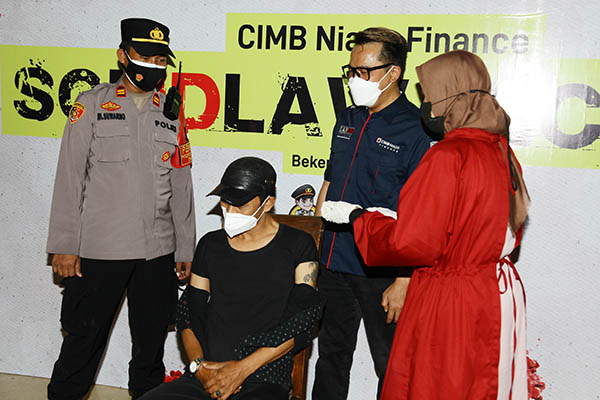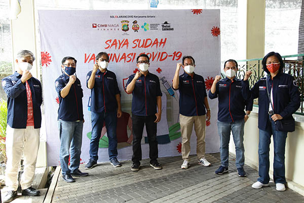 Presiden Direktur CIMB Niaga Finance, Ristiawan Suherman (kanan) bersama Kanit Sabara Polsek Pasar Minggu M. Suwarno (kiri) tengah menyaksikan kegiatan Program Vaksinasi COVID-19 bagi karyawan, nasabah, rekanan dealer CIMB Niaga Finance dan masyarakat umum yang didukung oleh Polsek Pasar Minggu dan Kementerian Kesehatan Republik Indonesia (Kemenkes RI), di Jakarta, Sabtu 7 Agustus 2021. Program Vaksinasi COVID-19 ini bertujuan mendukung program akselerasi vaksinasi COVID-19 pemerintah guna menciptakan kekebalan kelompok (herd immunity) menuju pemulihan ekonomi nasional. Program vaksinasi ini juga merupakan bentuk kontribusi CIMB Niaga Finance pada penanggulangan pandemi COVID-19 di Indonesia.