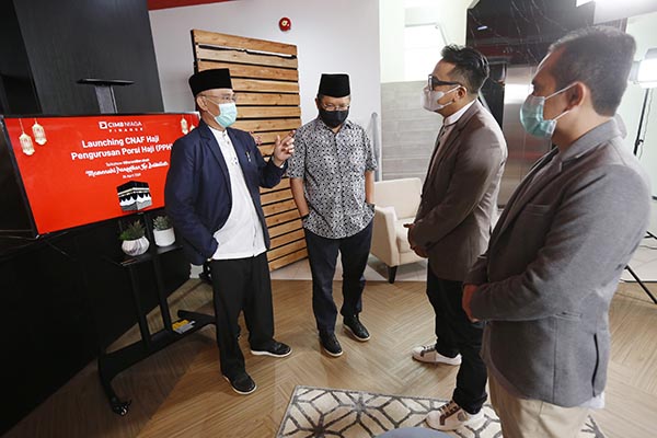 Presiden Direktur PT CIMB Niaga Auto Finance (CNAF) Ristiawan Suherman (kedua kanan) berbincang dengan Anggota Badan Pelaksanaan BPKH A Iskandar Zulkarnain (kiri), Ketua Pengurus Pusat Dewan Masjid Indonesia (DMI) Rudiantara (kedua kiri) dan Direktur Keuangan & Strategi CNAF Imron Rosyadi (kanan) saat peluncuran produk pengurusan porsi haji (PPH) “CNAF Haji” disela webinar talkshow Kajian Ramadhan yang mengangkat tema “Memenuhi Panggilan ke Baitullah” di Jakarta, Senin, 26 April 2021. Produk tersebut nantinya akan memberikan solusi guna mewujudkan ibadah haji bagi masyarakat Indonesia dengan lebih mudah. Diluncurkannya produk CNAF Haji juga sebagai wujud komitmen CNAF sebagai perusahaan pembiayaan yang mengutamakn customer experience.