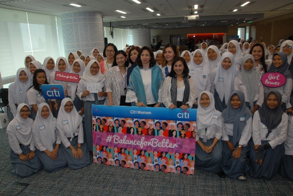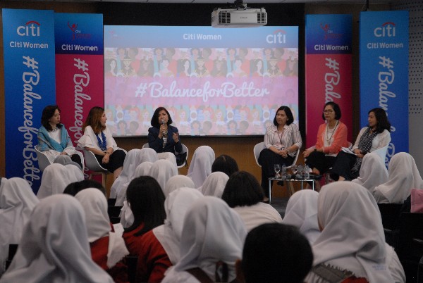 (kiri ke kanan) Novita S. Djani, Chairwoman Citi Indonesia Women Council dan Director, Sales Head Corporate and Public Sector, Treasury and Trade Solutions Citi Indonesia; Yoanna Darwin, Director, Market Management Head, Treasury & Trade Solutions Citi Indonesia; Sri Yuanita Mukti, Director, Head of Sales and Distribution, Consumer Banking Citi Indonesia; Junita Roemawi, Senior Vice President, Head of Citi Realty Services Citi Indonesia; Vera Sihombing, Director, Legal Council Citi Indonesia berbincang bersama dengan Elvera N. Makki, Director, Country Head of Corporate Affairs Citi Indonesia dalam sesi berbagi #BalanceforBetter di depan 100 pelajar perempuan SMU dan SMK. Citi Indonesia dan Citi IWC mengadakan sesi berbagi #BalanceforBetter dan kelas literasi keuangan dasar guna memperingati International Women’s Day, yang bertujuan untuk betapa pentingnya kesetaraan gender dan peran perempuan dalam setiap aspek kehidupan. (*)