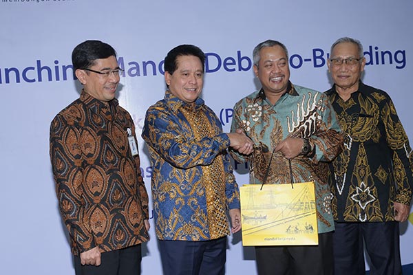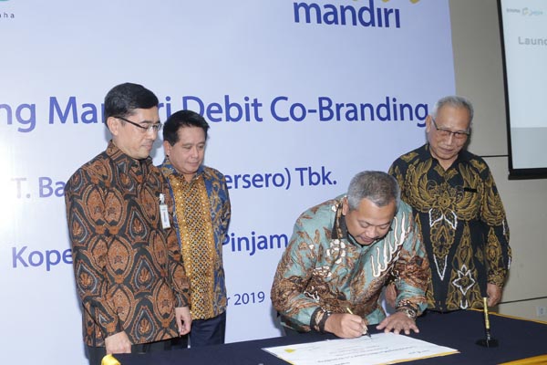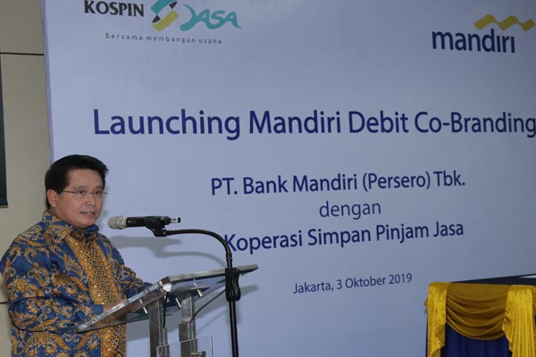 Regional CEO Bank Mandiri Jawa Tengah dan Yogyakarta Maswar Purnama, Direktur Bisnis dan Jaringan Bank Mandiri Hery Gunardi, Ketua Umum Koperasi Simpan Pinjam (Kospin) Jasa Andi Arslan dan Sekretaris Umum Kospin Jasa Sachroni (dari kiri) sedang memegang mock up Mandiri debit co branding di Jakarta, Kamis 3 Oktober 2019. Bank Mandiri bekerjasama dengan Kospin menerbitkan kartu Mandiri debit co-branding berdesign khusus yang akan memudahkan lebih dari 600 ribu anggota Kospin Jasa dalam bertransaksi . Selain itu, untuk memudahkan nasabah Kospin Jasa dalam menerima pengiriman dana dari bank lain, Mandiri menyediakan layanan virtual account host to host.