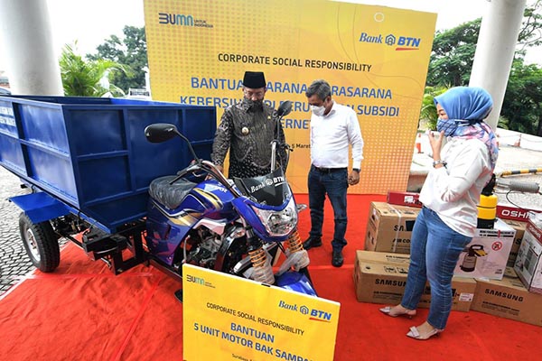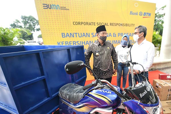 Plt Direktur Utama PT Bank Tabungan Negara (Persero) Tbk Nixon LP Napitupulu menyerahkan bantun Corporate Social Responsibility (CSR) kepada Wakil Bupati Lamongan KH Abdul Rouf di Surabaya, Jawa Timur, Jumat 5 Maret 2021. Bantuan CSR berupa sepeda motor bak sampah dan sarana prasarana kebersihan tersebut merupakan bagian dari kegiatan CSR dalam rangka HUT ke 71 tahun Bank BTN berupa fogging gratis di 71 perumahan subsidi yang dibiayai oleh Bank BTN dan wifi gratis untuk mendukung sarana belajar anak di 71 desa yang berada di sekitar kantor wilayah perseroan seluruh Indonesia. Bantuan CSR tersebut diharapkan dapat membantu masyarakat dalam menanggulangi penyebaran covid-19 di lingkungan perumahan dan memastikan proses belajar anak tetap berjalan.