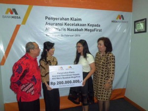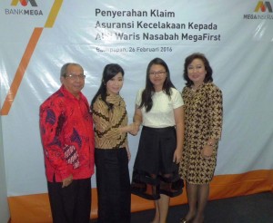 (Kiri-kanan) Direktur PT Mega Insurance-Lukman Siregar,Direktur Funding & Network PT Bank Mega Tbk-Diza Larentie,Stefanie Chandra (ahli waris dari nasabah) dan Vice President Bank Mega Kalimantan-Theresia Sandhora Alfoncia,berbincang usai penyerahan dana pertanggungan secara simbolis di Balikpapan Kalimantan,Jumat 26 Februari 2016.Bank Mega menyerahkan dana pertanggungan asuransi kepada ahli waris nasabah Mega First yang merupakan salah satu korban musibah kecelakaan pesawat Air Asia yang terjadi tahun lalu.Setiap nasabah MegaFirst mendapatkan asuransi kecelakaan diri secara gratis (personal accident insurance) dengan nilai pertanggungan sebesar Rp. 200.000.000,- (Dua Ratus Juta Rupiah) yang bekerja sama dengan Mega Insurance.(*)