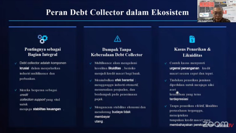 Menurut paparan Eko dalam presentasinya, debt collector berperan sebagai credit collection support yang vital bagi perusahaan multifinance dan perbankan. Tanpa mereka, kredit macet akan menumpuk, mengganggu likuiditas perusahaan, dan berpotensi memicu efek berantai pada industri otomotif serta penerimaan pajak.