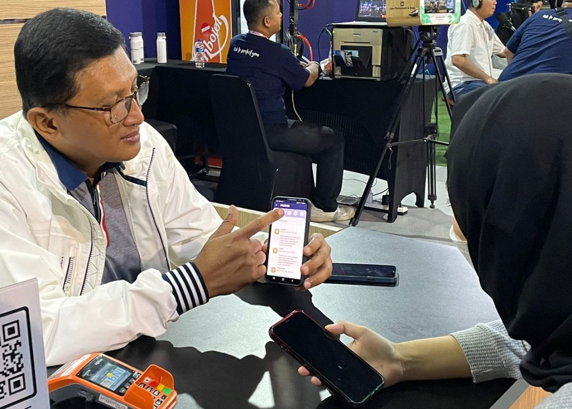 Direktur Utama Askrindo, Priyastomo melayani pengunjung saat melakukan transaksi pembelian Asuransi Kecelakaan Diri Askrindo melalui aplikasi di booth digiAsk pada gelaran Java Jazz Festival 2022. DigiAsk dari Askrindo memberikan proteksi asuransi kecelakaan diri untuk seluruh penonton, artis dan crew saat gelaran Java Jazz Festival 2022.