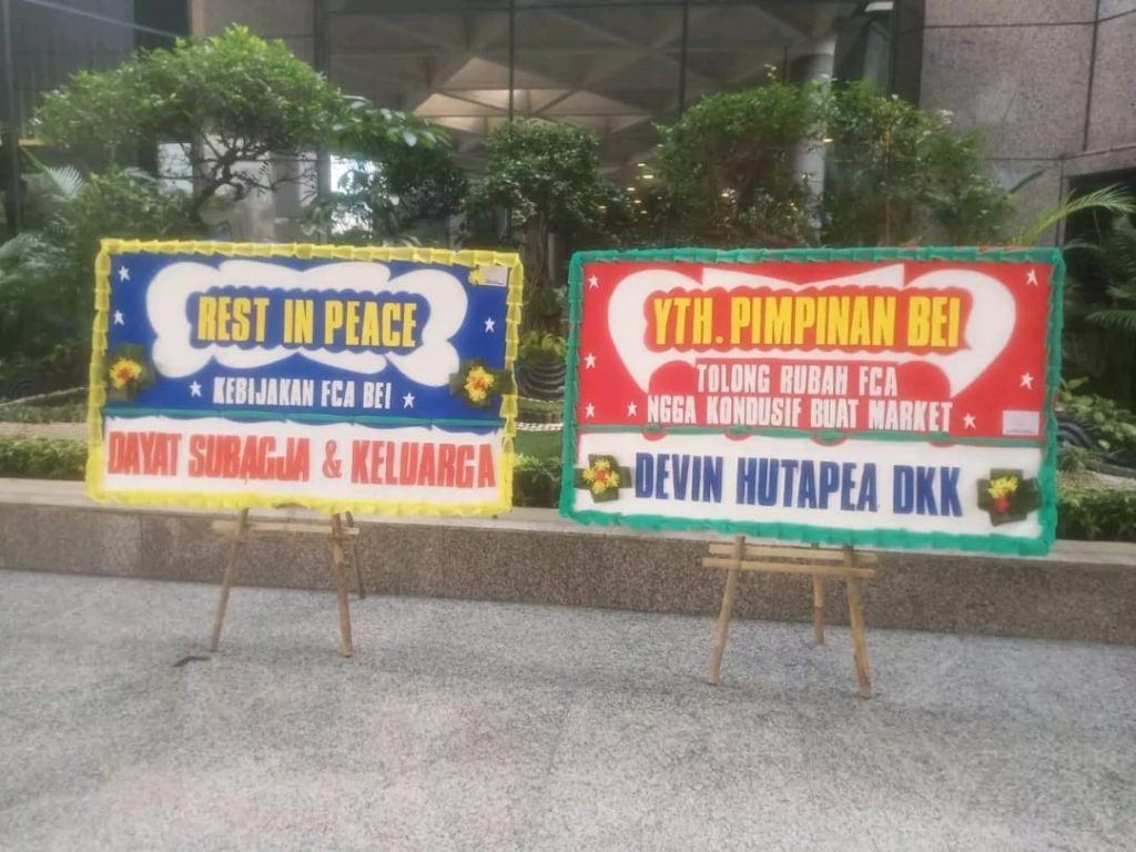 “Yth. Pimpinan BEI, tolong rubah FCA ngga kondusif buat market,” demikian bunyi karangan bunga yang dikirimkan oleh Devin Hutapea dkk pada 30 Mei 2024.