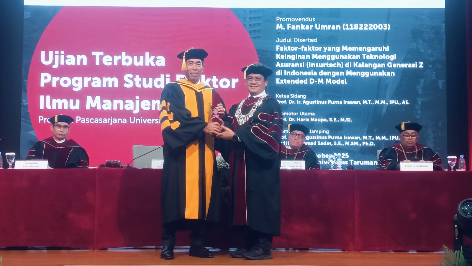 Dalam ujian terbuka yang diadakan Senin (27/10) di Untar, Fankar mengambil disertasi berjudul “Faktor-Faktor yang Memengaruhi Keinginan Menggunakan Teknologi Asuransi (Insurtech) di Kalangan Generasi Z di Indonesia dengan Menggunakan Extended D-M Model.”