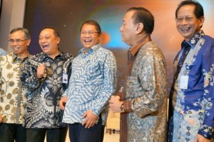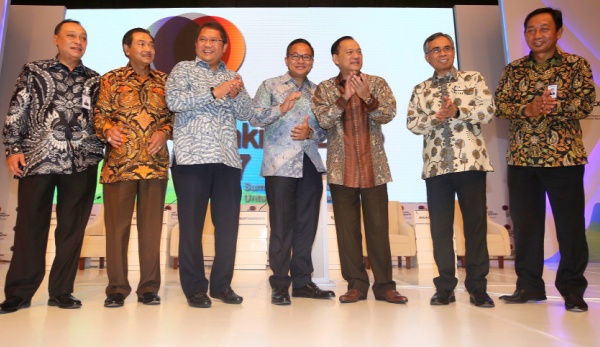 Direktur Utama (Dirut) BTN Maryono yang sekaligus sebagai Ketua Himpunan Bank Milik Negara (kiri) bersama Ketua Panitia IBEX 2017 Sis Apik Wijayanto (kanan), Gubernur Bank Indonesia Agus DW Martowardojo (ketiga kanan), Dirut Bank Mandiri Kartika Wirjoatmodjo, Menkominfo Rudiantara, Dirut BRI Suprajarto saat acara pembukaan Indonesia Banking Expo 2017 di Jakarta, Selasa (19/9).