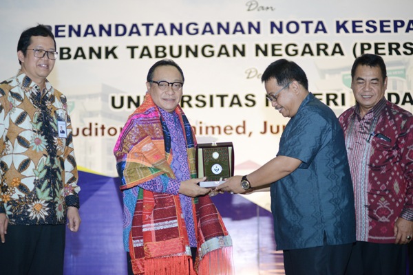 Direktur Utama PT Bank Tabungan Negara (Persero) Tbk yang juga sebagai Ketua Himbara Maryono didampingi Direktur Bank BTN Mahelan (kiri) dipakaikan kain ulos oleh Wakil Rektor I Universitas Negeri Abdul Hamid (kanan) di sela acara kuliah umum dengan tema Prospek Dan Tantangan Perbankan Dan Industri Perumahan Indonesia di Era Digitalisasi, di Universitas Negri Medan, Jumat (27/10).