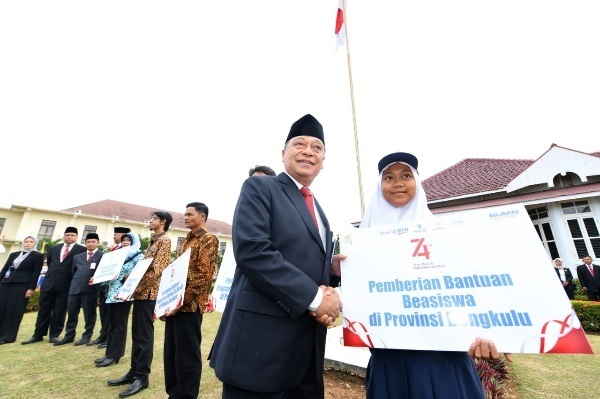 Direktur Utama BTN Maryono menjadi pemimpin upacara dalam peringatan HUT ke-74 Republik Indonesia di Bengkulu, Sabtu (17/8). Perayaan HUT RI di Bengkulu menjadi moment puncak program BUMN hadir untuk negeri di wilayah tersebut yang dikoordinasi oleh BTN. Usai kegiatan upacara BTN menyerahkan bantuan CSR senilai Rp1.8 Miilyar kepada pemerintah propinsi Bengkulu untuk mendukung kegiatan sosial kemasyarakatan terkait elektrifikasi, bantuan air bersih dan mck, perbaikan rumah warga, beasiswa pendidikan dan sembako bagi masyarakat tak mampu di wilayah Bengkulu. (*)