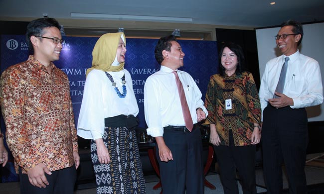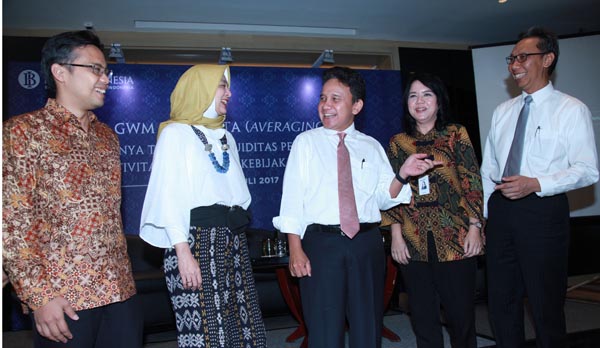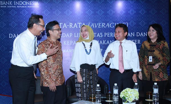 Deputi Gubernur Senior Bank Indonesia (BI) Mirza Adityaswara (kedua kanan) berbincang dengan Kepala Departemen Komunikasi BI Tirta Segara (kiri), Direktur Kebijakan Ekonomi dan Moneter BI Yoga Affandi (kedua kiri), Pengamat Ekonomi Lana Soelistianingsih (tengah), dan Group Head Treasury Bank Mandiri Farida Thamrin (kanan) usai menjadi pembicara pada diskusi ekonomi di Jakarta, Senin 3 Juli 2017. Diskusi tersebut bertema Giro Wajib Minimum (GWM) Averaging, Dampaknya Terhadap Stabilitas Moneter dan Pertumbuhan Ekonomi. BI mengeluarkan instrumen moneter GWM, yang diharapkan akan mengurangi risiko pengetatan likuiditas pada perbankan.
