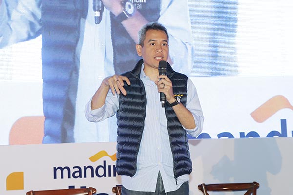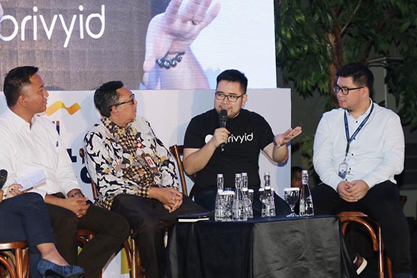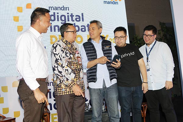 VP Digital Banking Bank Mandiri BD Budi Prasetyo, Executive Director Inovasi Keuangan Digital (IKD) OJK Triyono Gani, Direktur Utama Mandiri Capital Indonesia (MCI) Eddi Danusaputro, CEO PrivyID Marshall Pribadi dan Chief Marketing Officer Koinworks Jonathan Bryan (kiri ke kanan) tengah berbincang sebelum menjadi pembicara diskusi di sela-sela Mandiri Digital Incubator Startup Demo Day 2019 di Jakarta, Selasa 18 Juni 2019. Diskusi yang dihadiri oleh pelaku di ekosistem digital tersebut diharapkan dapat memotivasi perusahaan untuk melakukan transformasi digital dalam pengembangan usaha, antara lain melalui pemanfaatan inovasi keuangan digital. Pada Demo Day ini, sebanyak 11 startup tekfin mempromosikan inovasi keuangan yang mereka kembangankan seperti di bidang personal financial management, remittance, payment dan lainnya.