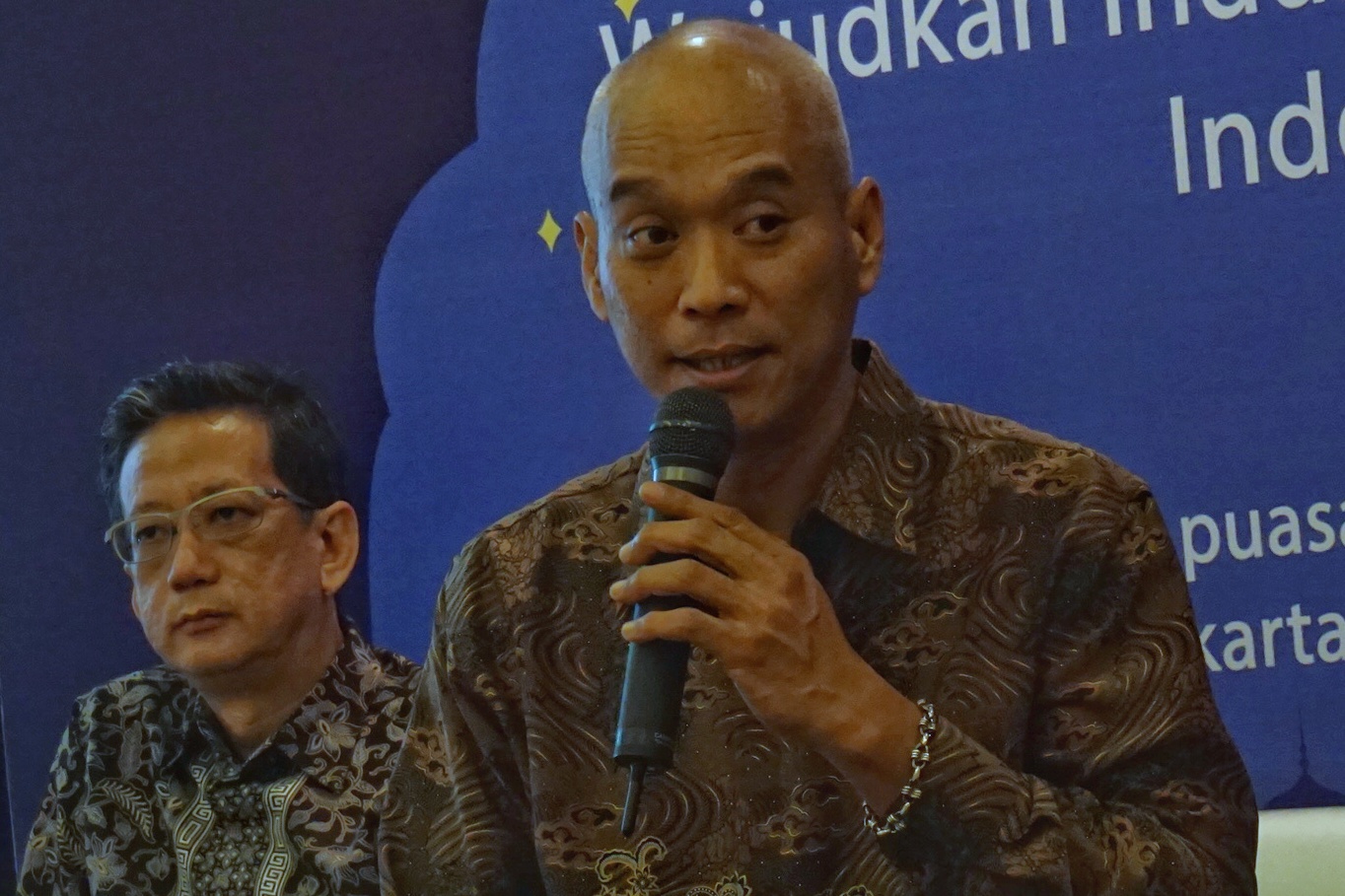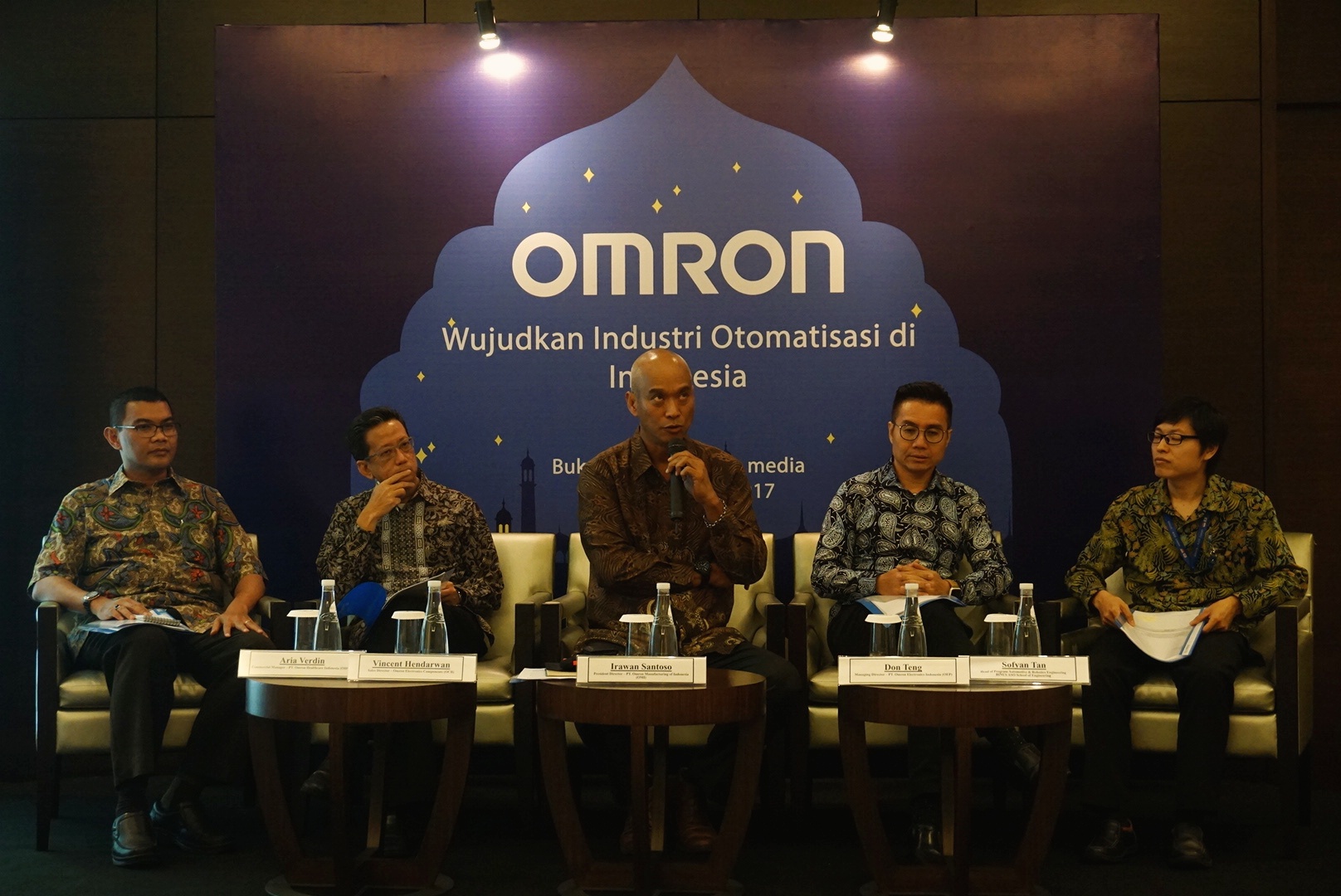 Preside Direktur PT Omron Manufacturing Indonesia, Irawan Santosa (tengah) bersama Head of Program Automotive & Robotics Engineering BINUS School, Sofyan Tan (kanan) Managing Director PT Omron Elektronics Indonesia, Don Teng (kedua kanan), Sales Director, Vincent Hendrawan (kedua kiri) dan Commercial Manager PT Omron Healthcare Indonesia, Aria Verdin (kiri), memberikan pemaparan dalam diskusi Industri Otomatisasi di Jakarta, Selasa 13 Juni 2017. Diskusi tersebut membahas industri di Indonesia sedang memasuki era otomatisasi baru dimana robot dan komputer saat ini dapat menyelesaikan pekerjaan yang memerlukan kemampuan kognifit.(Himawan Nugraha)