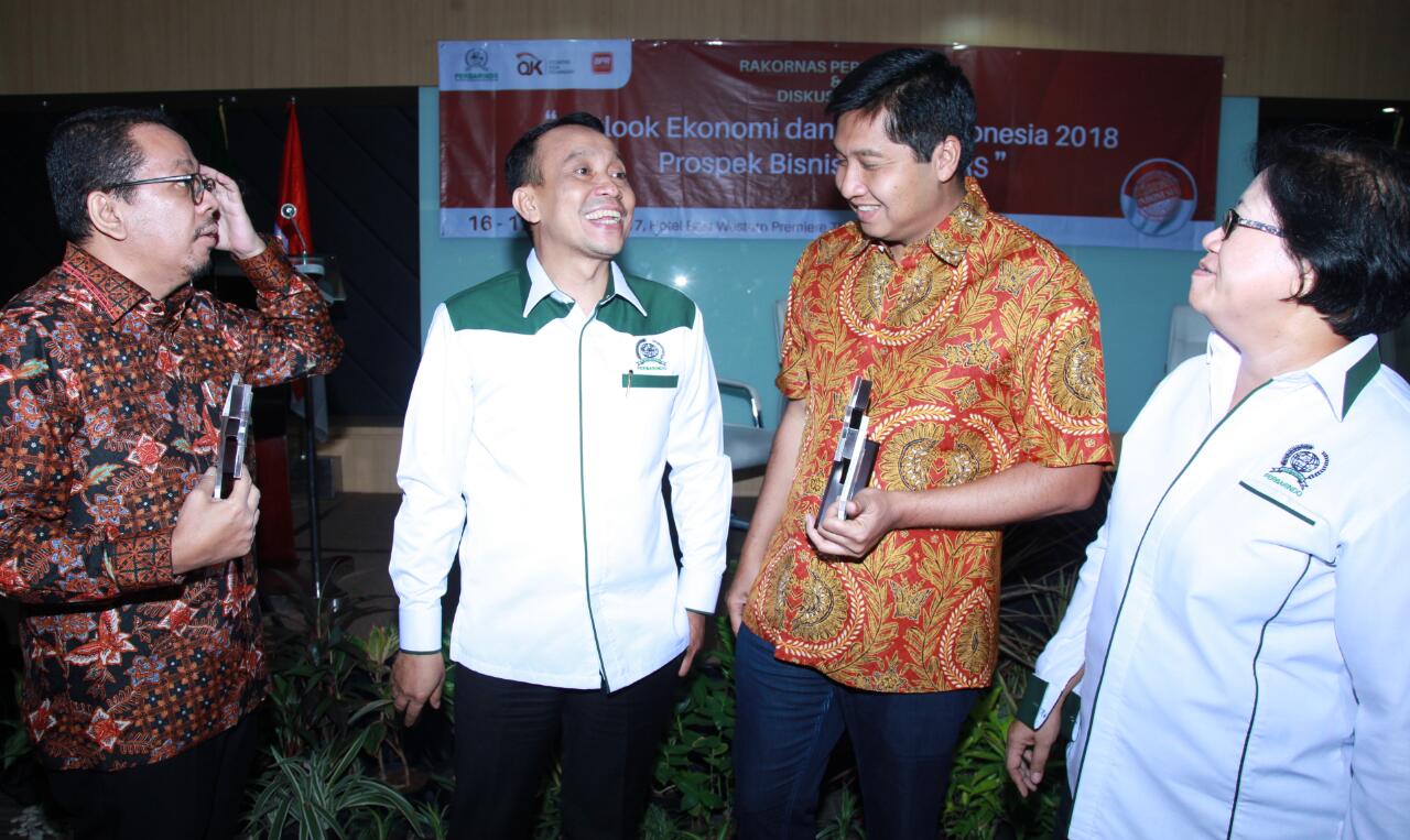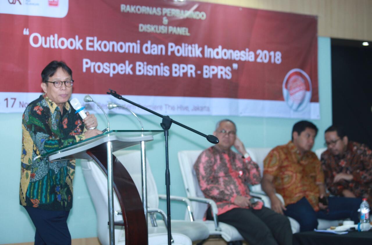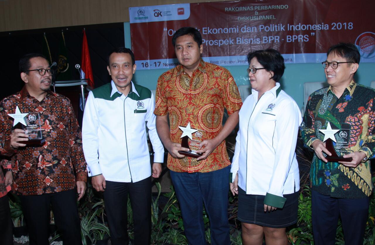 Ketua Umum Perbarindo, Joko Suyanto tengah menyerahkan cendera mata kepada anggota Komisi XI DPR RI, Maruar Sirait disaksikan Ekonom Senior Bank BNI, Ryan Kiryanto (kanan) dan Direktur Eksekutif Indobarometer, M. Khudori usai diskusi publik di Jakarta, Kamis 16 November 2017. Dalam diskusi tentang outlook ekonomi dan politik Indonesia 2018, prospek bisnis BPR-BPRS yang diadakan Perbarindo yang dihadiri perwakilan DPD Perbarindo tersebut sangat diharapkan UU perbankan direvisi agar pemerintah lebih berpihak pada bank perkreditan rakyat (BPR). (*)