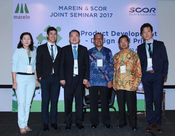 PT Maskapai Reasuransi Indonesia Tbk (Marein), Sutadi (ketiga kanan) tengah berbincang dengan Head of Pricing SCOR Global Life, Ian Cheng, Senior Marketing Actuary SCOR Global Life, Noelle Lee, Head of SEA and India, Life and Health, Louis Heng, Aktuaris Marein Kasir Iskandar dan Senior Pricing Actuary SCOR Global Life Leo Liu (kiri ke kanan) disela acara joint seminar sehari tentang asuransi dengan Tema “Product Development – Design and Pricing” yang diadakan di Jakarta Rabu, 30 Agustus 2017.