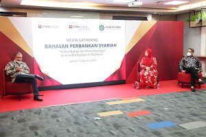 Direktur Syariah Banking CIMB Niaga Pandji P. Djajanegara (kiri) berbincang bersama Sekretaris Jenderal Asosiasi Bank Syariah Indonesia (ASBISINDO) Herwin Bustaman (kanan) dan Anggota Badan Pelaksana Badan Pengelolaan Keuangan Haji (BPKH) Dr. Hurriyah El Islamy, LLB (hons), MCL, Ph.D (tengah) dalam diskusi tentang Bahasan Perbankan Syariah bertema “Pertumbuhan dan Perkembangan Unit Usaha Syariah di Indonesia” yang diselenggarakan CIMB Niaga Syariah dan Asosiasi Bank Syariah Indonesia (ASBISINDO) di Jakarta, Senin, 15 Agustus 2022. Insan perbankan syariah di Indonesia dan ASBISINDO mendukung Rancangan Undang-Undang Pengembangan dan Penguatan Sektor Keuangan (RUU P2SK) yang menghapuskan kewajiban pemisahan (spin-off) Unit Usaha Syariah (UUS) dari Bank Induk di tahun 2023. Kewajiban spin-off UUS hanya berlaku apabila porsi aset telah mencapai 50% atau lebih dari Bank Induknya.
