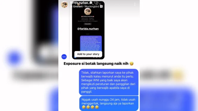 “Tidak, silahkan laporkan saya ke pihak berwajib kalau menurut and aitu perlu. Sebagai WNI yang baik saya akan mengikuti peraturan dan panggilan dari pihak yang berwajib apabila saya dipanggil,” ujar Farida Nurhan di Insta Story pada Minggu, 24 September 2023.