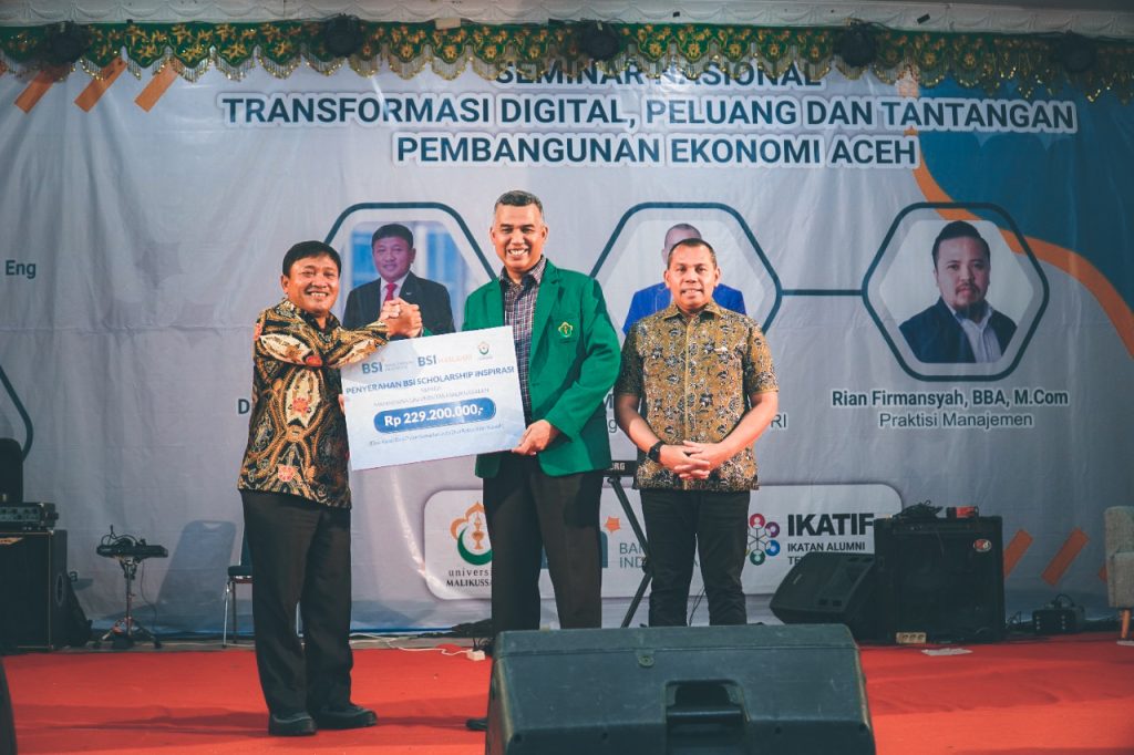 Wakil Direktur Utama Bank Syariah Indonesia BSI Bob Tyasika Ananta (tengah) saat menjadi salah satu pengisi acara pada seminar Nasional Transformasi Digital, Pejuang dan Tantangan Pembangunan Ekonomi Aceh bersama dengan Anggota Komisi VI DPR-RI Muslim dan Praktisi Manajemen Rian FIrmansyah di Universitas Malikussaleh, Aceh.Suasana seminar Nasional dengan tema Transformasi Digital, Pejuang dan Tantangan Pembangunan Ekonomi Aceh yang diadakan Bank Syariah Indonesia (BSI) yang dihadiri Wakil Direktur Utama Bank Syariah Indonesia BSI Bob Tyasika Ananta, Anggota Komisi VI DPR-RI Muslim dan Praktisi Manajemen Rian FIrmansyah di Universitas Malikussaleh, Aceh.Wakil Direktur Utama Bank Syariah Indonesia (BSI) Bob Tyasika Ananta (kiri) saat memberikan bantuan beasiswa Program BSI Scholarship Inspirasi kepada Rektor Universitas Malikussaleh Dr. H. Herman Fithra, ST., MT., IPM., ASEAN.Eng.(kanan kedua) dan Anggota Komisi VI DPR-RI Muslim (kanan pertama) di GOR ACC Universitas Malikussaleh, Lhokseumawe, Aceh Utara, 21 November 2022.