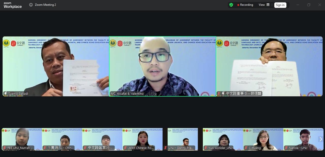 Penandatangan MoA ini dihadiri Ketua Dewan Direksi ChineseRd, Guo Xinlin dan Dekan Fakultas Bahasa dan Seni Universitas Negeri Jakarta (FBS-UNJ), Samsi Setiadi.