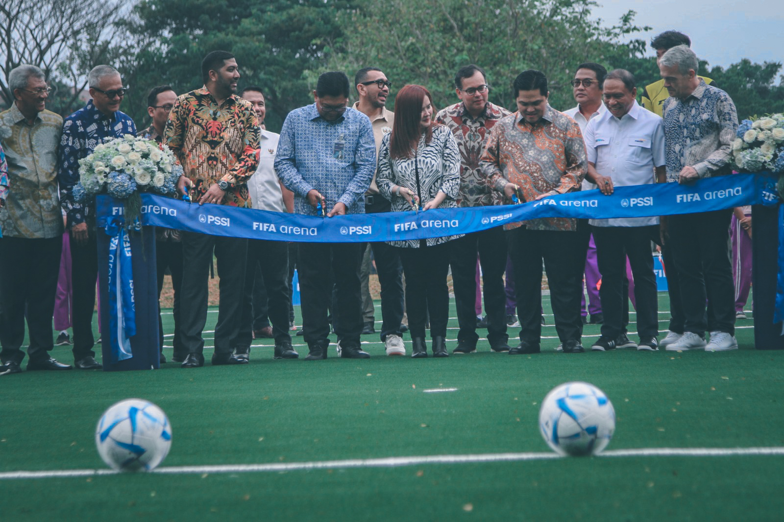 FIFA Lead Regional Office Lavin Vignesh, FIFA Council Member Kanya Keomany, Ketua Umum PSSI Erick Thohir dan Dirut Bank Mandiri Darmawan Junaidi melakukan tendangan seremoni peresmian lapangan mini-soccer FIFA Arena di kawasan Bank Mandiri Wijayakusuma, Jakarta, Selasa 6 Mei 2025.