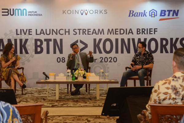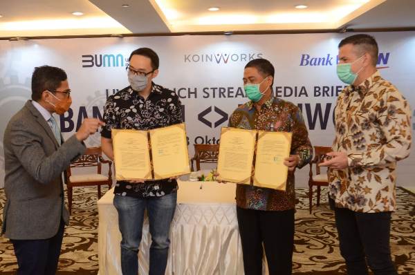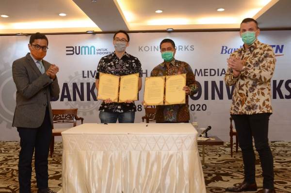 Direktur Utama PT Bank Tabungan Negara (Persero) Tbk. Pahala Nugraha Mansury (kiri) bersama CFO KoinWorks Mark Brunny (kanan) menyaksikan Direktur Consumer and Commercial Lending Bank BTN Hirwandi Gafar (kedua kiri) dan CEO & Co-Founder KoinWorks Benedicto Haryono menandatangani Perjanjian Kerja Sama antara Bank BTN dengan KoinWorks tentang Pemberian Pinjaman dengan Skema Supply Chain Financing melalui platform KoinWorks di Menara BTN, Jakarta, Kamis, Oktober 2020. Kerja sama strategis tersebut merupakan upaya Bank BTN untuk mendukung pembangunan pondasi perekonomian yang kuat dalam rangka Pemulihan Ekonomi Nasional (PEN) melalui sektor UMKM. Lewat kerja sama ini, calon debitur UMKM di sektor properti dapat mengakses kredit dari BTN melalui KoinWorks hingga Rp1 miliar. Kredit dapat langsung diterima calon debitur berdokumen lengkap dalam 5 hari.