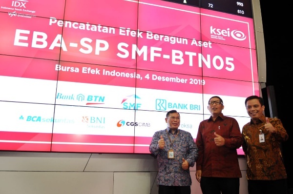 Direktur Finance, Planning & Treasury PT Bank Tabungan Negara (Persero) Tbk Nixon LP Napitupulu (kedua dari kanan) dan Direktur Utama PT SMF Ananta Wiyogo (ketiga dari kiri) bersama dengan Direktur Pelaksanaan Pembiayaan Perumahan Kementerian PUPR Adang Sutara, Senior EVP Direktorat Treasury And Global Services Bank BRI Listiarini Dewajanti dan Direktur Pengelolaan Investasi OJK, Halim Haryono serta Komisaris Utama SMF Iskandar Saleh meresmikan pencatatan EBA- SP SMF BTN 05 di Bursa Efek Indonesia, Jakarta, Rabu (4/12). Adapun nilai total EBA-SP sebagai instrumen hasil sekuritisasi dan tagihan KPR yang diperdagangkan senilai Rp2 triliun. Dengan tercatatnya EBA-SP SMF BTN 05 yang meraih rating id AAA dan sangat diminati pasar tersebut, maka Bank BTN telah tercatat 12 kali melakukan transaksi sekuritisasi dengan total nilai EBA mencapai sebesar Rp11,65 triliun. (*)