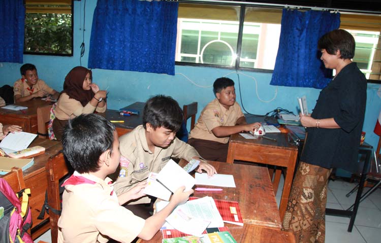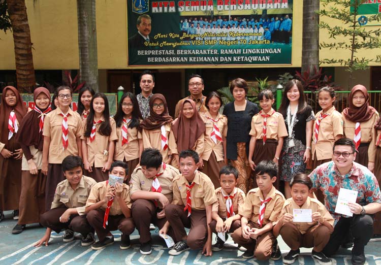 Country Head of Audit Standard Chartered (Stanchart) Dawny Tahar memberikan edukasi keuangan kepada pelajar sekolah SMPN 70 Tanah Abang saat pelaksanaan program Financial Education for Youth (FE4Y), di Jakarta, Rabu 26 April 2017. Melalui program ini, Stanchart melibatkan sejumlah karyawan dalam memberikan pengetahuan dasar pengelolaan keuangan kepada lebih dari 250 orang pelajar di sekolah yang sekaligus menjadi acara puncak rangkaian kegiatan peringatan Hari Kartini.(Erman Subekti)