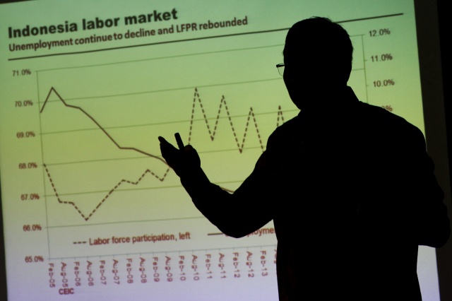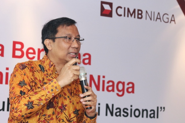 Chief Economist CIMB Niaga, Adrian Panggabean (kiri), didampingi Head Of Marketing, Brand and Communicationa CIMB Niaga, Slamet Sudijono (kanan) memberikan pemaparan terkait pertumbuhan ekonomi nasional di Jakarta, Senin 17 Juli 2017. Menurut Adrian, perekonomian Indonesia masih menghadapi tantangan untuk mencapai pertumbuhan 7% meski pada semester pertama 2017 perekonomian mengalami tren perbaikan dibanding tahun lalu. (Himawan Nugraha)