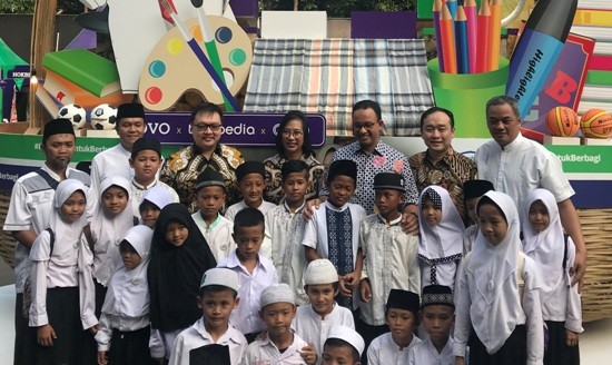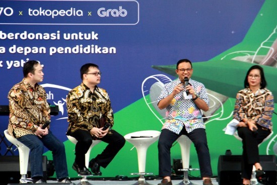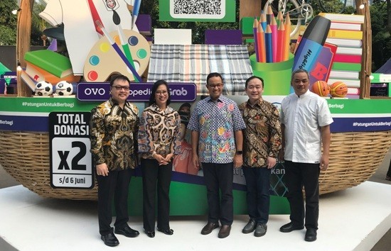 Gubernur DKI Jakarta Anies Baswedan (kedua kanan) berbincang bersama Direktur OVO Harianto Gunawan (kiri), Managing Director Grab Indonesia Neneng Goenadi (kanan) dan Co-Founder dan Vice Chairman Tokopedia Leontinus Alpha Edison (kedua kiri) usai penyerahan simbolis donasi program “Patungan Untuk Berbagi” yang diadakan pada 25 – 26 Mei 2019 di Parkir Selatan, Senayan, Jakarta, Minggu 26 Minggu 2019. Selain menghadirkan berbagai hiburan, pengunjung festival dapat berpartisipasi dalam acara buka puasa bersama lebih dari 500 anak yatim. OVO, Tokopedia dan Grab akan menyalurkan lebih Rp5 miliar hingga saat ini bagi pendidikan anak-anak yatim, piatu dan kurang mampu melalui gelombang donasi pertama program “Patungan Untuk Berbagi” yang dilakukan serentak di 8 kota besar di Indonesia.