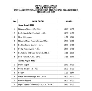 Namun demikian, Heri Gunawan Anggota Komisi XI dari Fraksi Gerindra memastikan bahwa fit and proper test akan tetap dilaksanakan dibulan yang sama. Menurutnya, Komisi XI sudah mengagendakan ulang jadwal fit and proper test calon DK OJK di tanggal 6-7 April 2022.