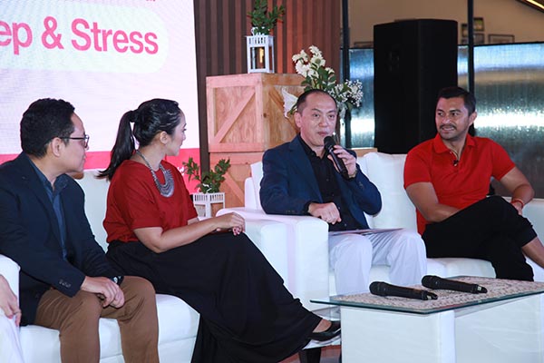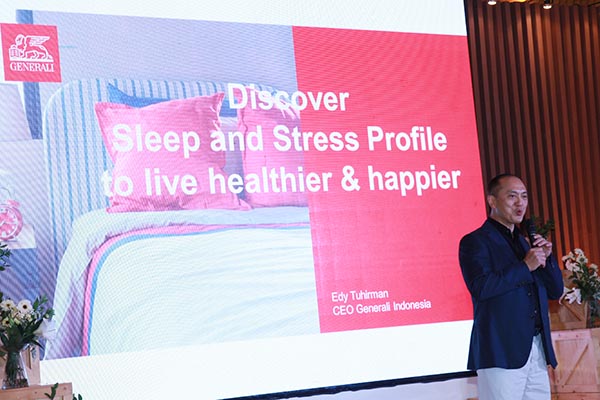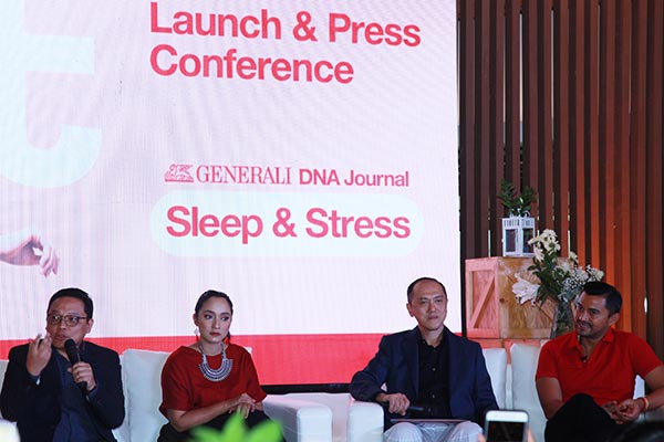 CEO Generali Indonesia Edy Tuhirman (kedua kiri) berbincang dengan dr. Andreas Prasadja (Specialist Doctor), Bella Fawzi (Public Fiigure) dan Public Figure & Yoga Instructor Anjasmara (kiri ke kanan) saat peluncuran fitur Sleep and Stress di Jakarta. Rabu 4 Maret 2020. Fitur Sleep and Stress, nantinya akan membantu nasabah mengenali profil tidur, tingkat ketahanan & toleransi terhadap stres serta potensi gangguan tidur sesuai dengan DNA masing-masing. Layanan ini merupakan fitur terbaru dari Generali DNA Journal yang juga mampu memberikan analisa variasi genetik terhadap kebutuhan nutrisi, sensitivitas pada kandungan makanan serta hal-hal umum lainnya yang menyangkut stamina dan kesehatan tubuh.