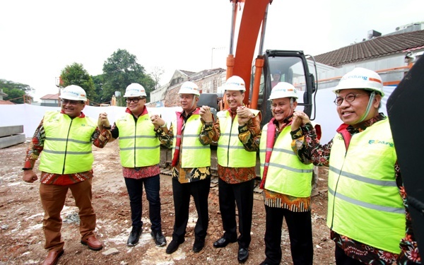 Direktur Human Capital, Investasi & Pengembangan Wika Gedung Nur Al Fata, Dirut Wika Gedung Nariman Prasetyo, Dirut Wika Tumiyana, Dirut Bank Mandiri Kartika Wirjoatmodjo, Direktur Keuangan & Strategi Bank Mandiri Panji Irawan dan Dirut Bank Mantap Josephus K Triprakoso (kiri ke kanan) menyatukan tangan usai penandatangan prasasti pembangunan Graha Mantap di Jl. Proklamasi, Cikini, Jakarta, Jumat 18 Oktober 2019. Pembangunan Graha Mantap di atas aset Bank Mandiri ini dikerjakan Wika Gedung dengan sistem kerjasama BOT (Build, Operate, Transfer) selama 30 tahun. Nantinya sebagian besar gedung yang ditargetkan selesai pada 2020 ini akan digunakan sebagai kantor pusat perusahaan anak, Bank Mantap