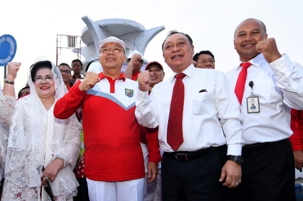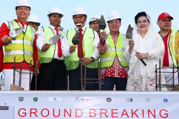 Direktur Utama BTN Maryono bersama Gubernur Bengkulu Rohidin Mersyah (kiri), Asisten Deputy Restrukturisaasi, Pendayagunaan Portfolio Kepemilikan Negara Minoritas Kementerian BUMN Aditya Dharmawantara (kedua kiri) dan Ketua Yayasan Fatmawati Hildawati Hassan Din (kedua kanan) bersama perwakilan 11 BUMN lainnya melakukan peletakan batu pertama monumen patung fatmawati di Simpang Lima kota Bengkulu, Sabtu (17/8). BTN bersama 11 BUMN lainnya memberika komitmen untuk bersama-sama membangun monumen patung pahlawan Fatmawati tersebut. Menurut rencana patung akan dibuat oleh pematung Indonesia Nyoman Nuarta yang bergambar Fatmawati sedang menjahit bendera pusaka merah putih dengan tinggi total mencapai 7 meter. (*)