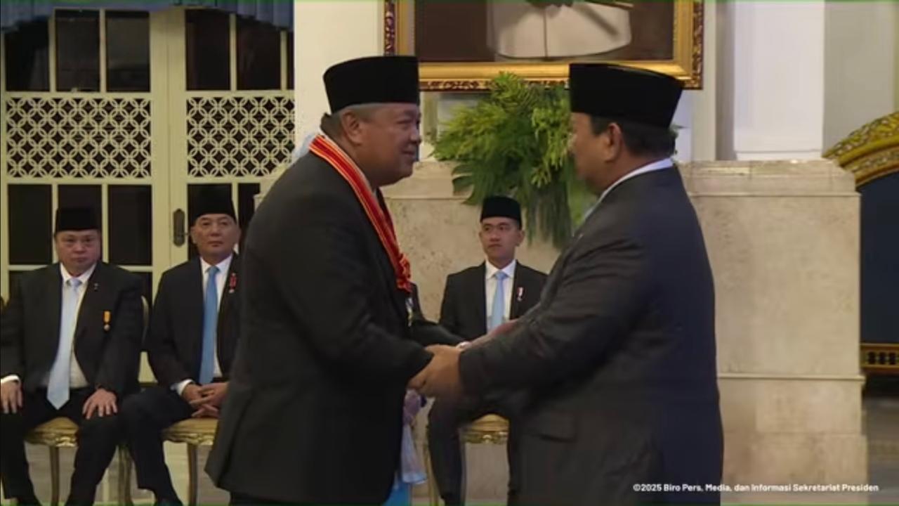 Jakarta – Gubernur Bank Indonesia (BI), Perry Warjiyo menerima Tanda Kehormatan Bintang Mahaputera Utama yang diserahkan langsung oleh Presiden Republik Indonesia, Prabowo Subianto.