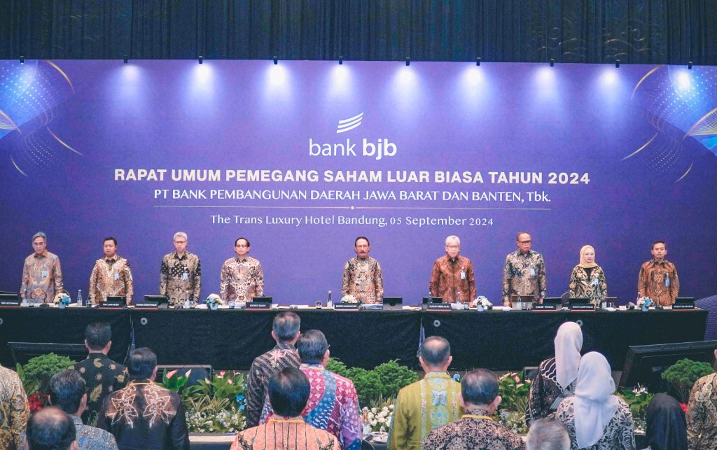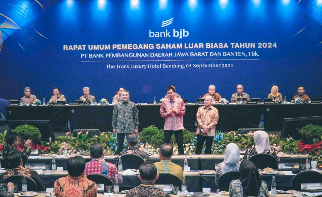 Direktur Utama Bank Pembangunan Daerah Jawa Barat dan Banten, Tbk (bank bjb) Yuddy Renaldi bersama jajaran direksi dan komisaris menghadiri Rapat Umum Pemegang Saham Luar Biasa (RUPSLB) di Bandung, Jawa Barat, Kamis 5 september 2024. Foto bank bjb