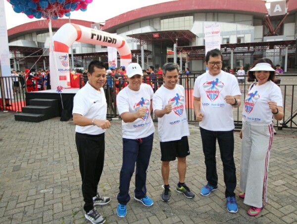 Managing Director Commercial Banking PT Bank Tabungan Negara (Persero) Tbk (BTN), Oni Febriarto bersama Managing Director Collection Asset Management and Legal Nixon LP Napitupulu, dan Managing Director Strategic, Compliance, & Risk Bank BTN Mahelan Prabantarikso mengangkat bendera start tanda dimulainya BTN Heroes Run di Jakarta (22/10).