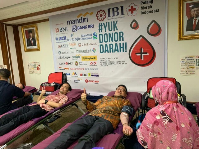 DONOR Darah Ikatan Bankir Indonesia (IBI) bekerjasama dengn PMI yang melibatkan jajaran perbankan dari karyawan, direksi dan komisaris bank, dengan jumlah mendonor 300 orang, di Menara Mandiri, Kamis, 5 Maret 2020. Hadir Ketua Umum IBI, Hariyanto Budiman dan jajaran pengurus seperti Lisawati, Anika Faisal, Farid Rachman dan Anggoro E. Cahyo serta anggota IBI lainya, seperti Evi Afiatin Ismail, Sis Apik Wijayanto, Hery Gunadi, Achmad Fadjar, Aviliani, Sigit Prastowo. Dalam kesempatan itu, IBI yang diwakili oleh Hariyanto Budiman menyerahkan sumbangan kepada PMI sebesar Rp200 juta disaksikan oleh Ketua PMI, HM Jusuf Kalla.