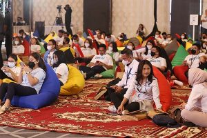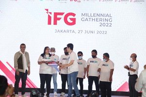 Ketua BUMN Muda IFG Leonardo Henry Gavaza, memberikan bantuan secara simbolis bantuan Tanggung Jawab Sosial Lingkungan disaksikan Wakil Direktur Utama IFG Hexana Tri Sasongko dan Staf Khusus III Menteri BUMN Arya Sinulingga di Jakarta, Senin, 27 Juni 2022. IFG memberikan bantuan berupa satu unit mobil operasional dan seperangkat multimedia terhadap para musisi disabilitas yang tergabung dalam Institut Musisi Jalanan di Acara IFG Millenials Gathering 2022.