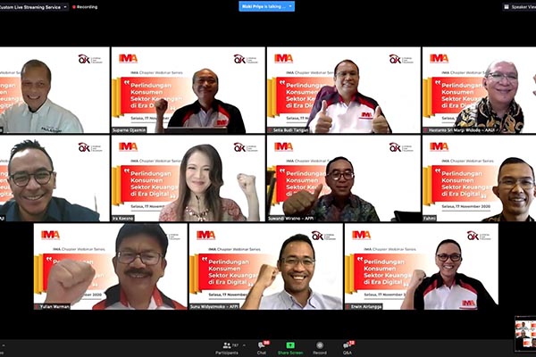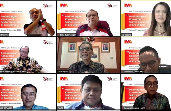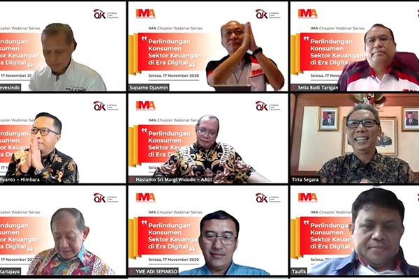 Anggota Dewan Komisioner Otoritas Jasa Keuangan (OJK) Bidang Edukasi, Tirta Segara (kanan atas) ketika Webinar Indonesia Marketing Association (IMA) berlangsung bersama President IMA, Suparno Djasmin (kiri atas), beserta Sekretaris Himpunan Bank Milik Negara (HIMBARA) Ahmad Solichin Lutfiyanto (kiri bawah), Ketua Asosiasi Perusahaan Pembiayaan Indonesia (APPI) Suwandi Wiratno (tengah bawah) dan Ketua Asosiasi Asuransi Umum Indonesia (AAUI) Hastanto Sri Margi Widodo di Jakarta, Selasa 17 November 2020. IMA menyelenggarakan webinar dengan para pelaku sektor keuangan di Indonesia, mulai dari Himpunan Bank Milik Negara (HIMBARA), Asosiasi Perusahaan Pembiayaan Indonesia (APPI), Asosiasi Fintech Pendanaan Indonesia (AFPI), Asosiasi Asuransi Umum Indonesia (AAUI) dan Asosiasi Asuransi Jiwa Indonesia (AAJI), hingga Asosiasi Modal Ventura Indonesia (AMVI) yang semuanya hadir untuk membagikan informasi dan pengetahuan baru bagi masyarakat Indonesia tentang literasi keuangan dan perlindungan konsumen, khususnya di era digital.
