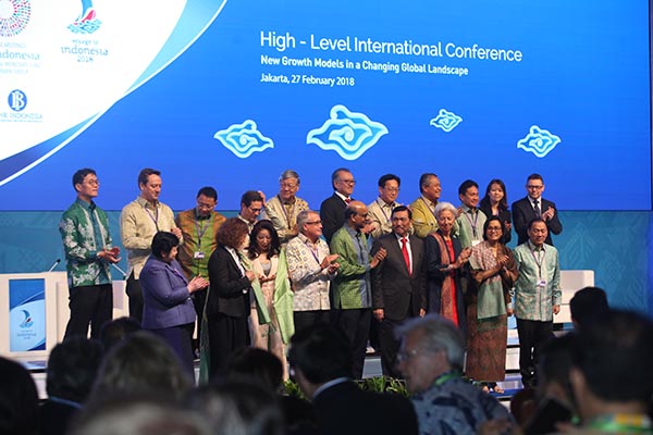 Menko Kemaritiman Luhut Binsar Pandjaitan (kedua kiri), Menteri Keuangan Sri Mulyani (kedua kanan) Gubernur BI Agus Martowardojo (kanan), Direktur Pelaksana IMF Christine Lagarde (tengah), dan Deputi Perdana Menteri Singapura Tharman Shanmugaratnam (kiri), berfoto bersama saat konferensi internasional tingkat tinggi di Jakarta, Selasa 27 Februari 2018.