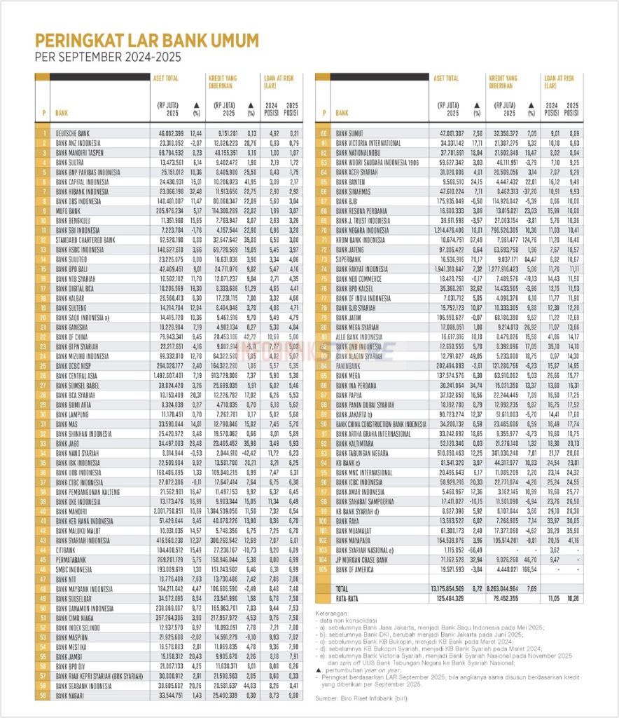 Jakarta – Infobank, melalui Biro Riset Infobank (birI), melakukan perbaikan atas perhitungan ulang loan at risk (LAR) perbankan yang sebelumnya ditampilkan dalam Majalah Infobank No. 573 edisi Januari 2026.