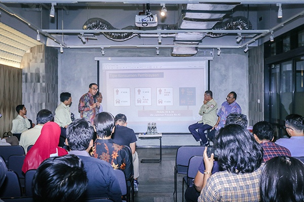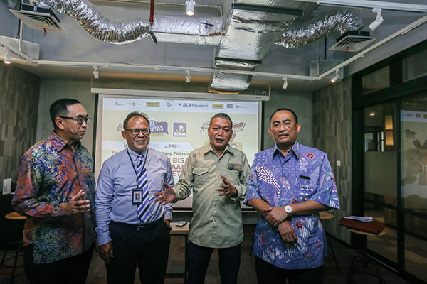 Ketua Umum Asosiasi Perusahaan Pembiayaan Indonesia (APPI) Suwandi Wiratno, Kepala Departemen Pengawasan IKNB 2B OJK Bambang W. Budiawan, Chairman Infobank Institute Eko B Supriyatno, Pengamat Keuangan Firman Wijaya (kiri ke kanan) melakukan sesi foto bersama saat media discussion di Jakarta, Senin, 10 Februari 2020. Perusahaan leasing (multifinance) masih tetap bisa menarik kendaraan dari debitur tanpa melalui pengadilan negeri (PN) pasca putusan Mahkamah Konstitusi (MK) tentang Fidusia. Putusan MK tersebut justru memperjelas Pasal 15 Undang-undang (UU) No. 42 Tahun 1999 tentang Wanprestasi atau Cedera Janji antara Debitur dan Kreditur.