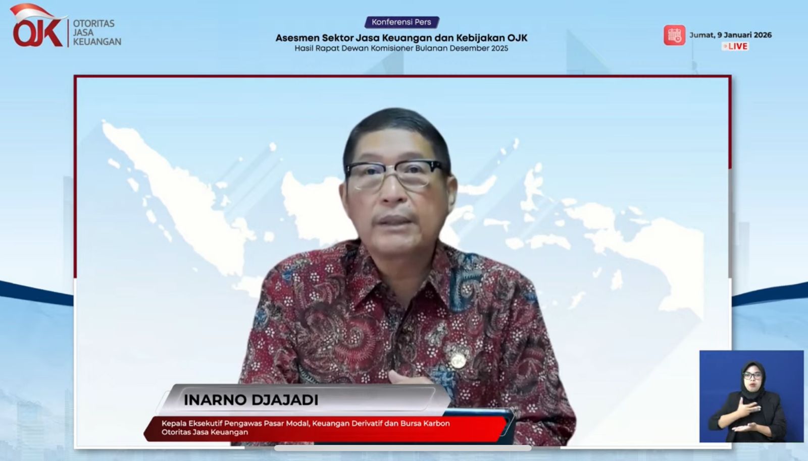 Kepala Eksekutif Pengawas Pasar Modal, Keuangan Derivatif, dan Bursa Karbon OJK, Inarno Djajadi dalam konferensi pers hasil Rapat Dewan Komisioner (RDK) Bulanan secara virtual, Jumat, (9/1/2026). (Tangkapan layar YouTube Otoritas Jasa Keuangan: Khoirifa)