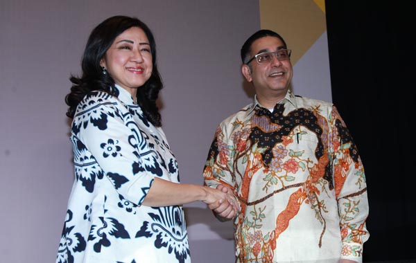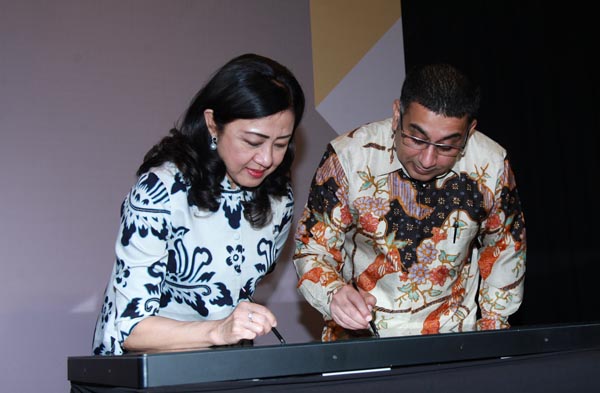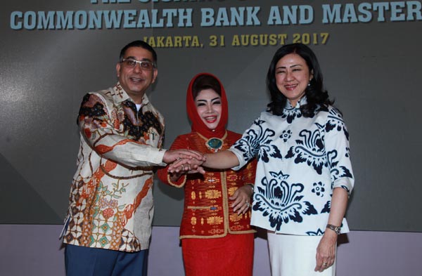 President Director Commonwealth Bank, Lauren Sulistiawati (kanan) bersama Division President, Indonesia, Malaysia & Brunei, Mastercard Safdar Kha (kiri) berbincang saat meresmikan kolaborasi strategis untuk memperkuat inklusi keuangan perempuan Indonesia lewat digital di Jakarta, Kamis 31 Agustus 2017. Diharapkan, penguatan inklusi keuangan perempuan akan berkontribusi pada peningkatan kesejahteraan finansial masyarakat Indonesia dan memperkuat ekonomi Indonesia secara keseluruhan. (*)