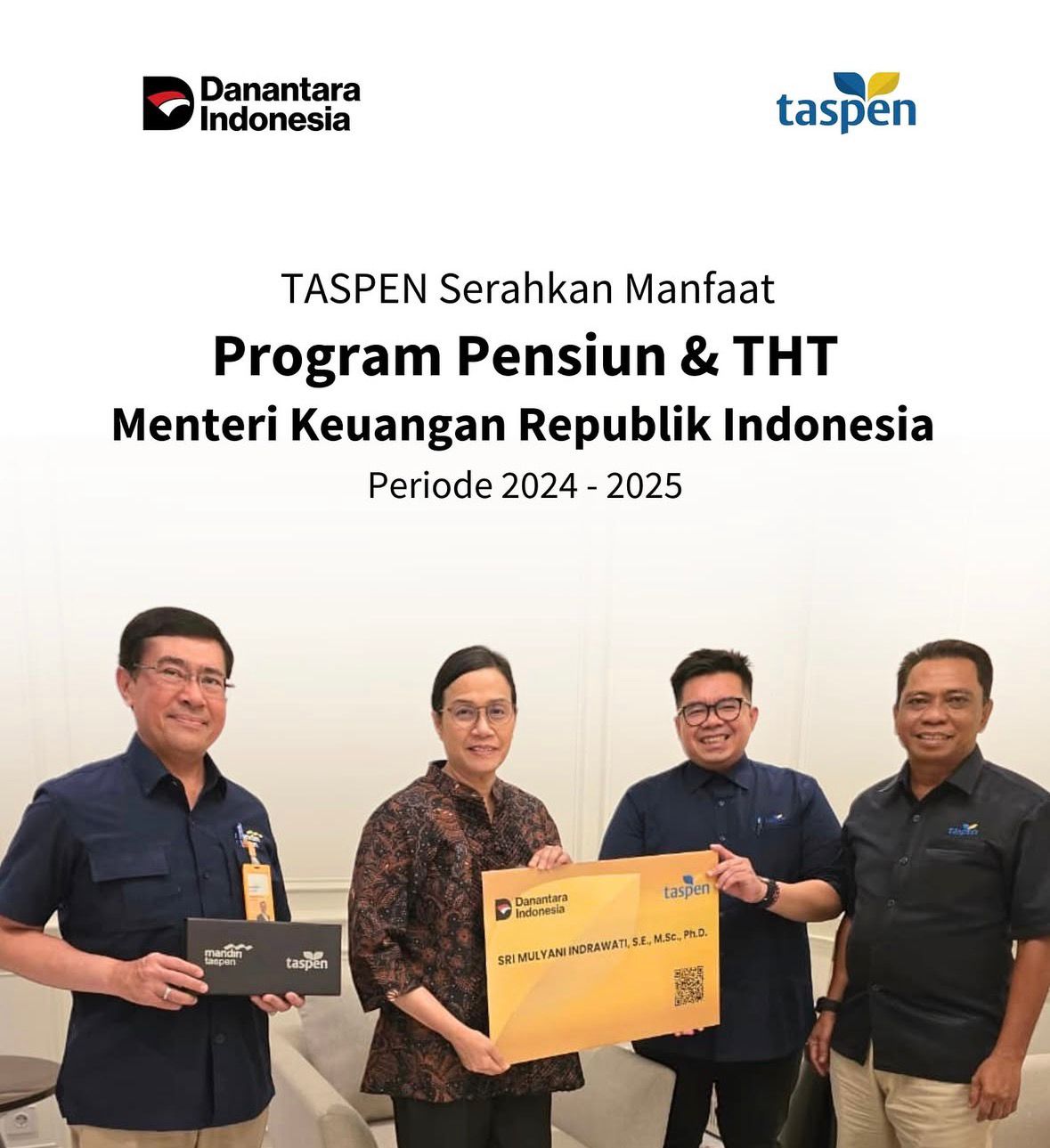 “Komitmen ini diwujudkan melalui penyaluran manfaat Program Pensiun dan Tabungan Hari Tua (THT) kepada Menteri Keuangan Republik Indonesia Periode 2024 – 2025, Ibu Sri Mulyani Indrawati,” tambah Taspen.