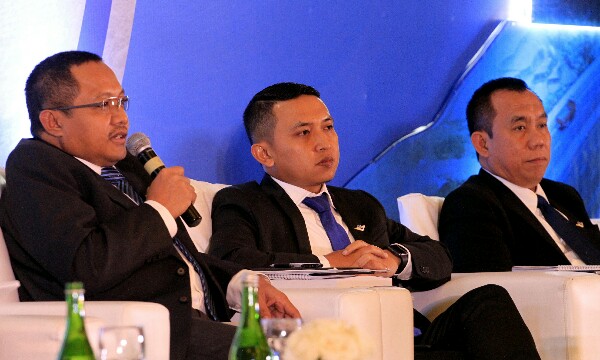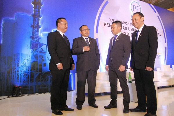 President Director PT PP Presisi Iswanto Amperawan (dua kiri) berbincang kepada Director Benny Pidakso (dua kanan) Director Hasanin Ade Putra (kiri) dan Director Arief Subyandono (kanan) usai press conference IPO perseroan di Jakarta, Senin (23/10).