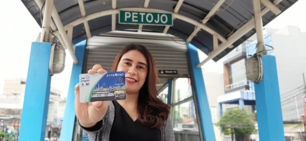 Seorang warga DKI Jakarta sedang menunjukkan kartu Jaklingko Bank DKI di Halte Transjakarta (22/11). JakLingko Bank DKI saat ini dapat dipergunakan untuk alat pembayaran transportasi publik yaitu, Transjakarta termasuk Trans Mikro, MRT Jakarta dan Railink Kereta Bandara Soekarno Hatta serta LRT Jakarta yang akan beroperasi dalam waktu dekat. (*)