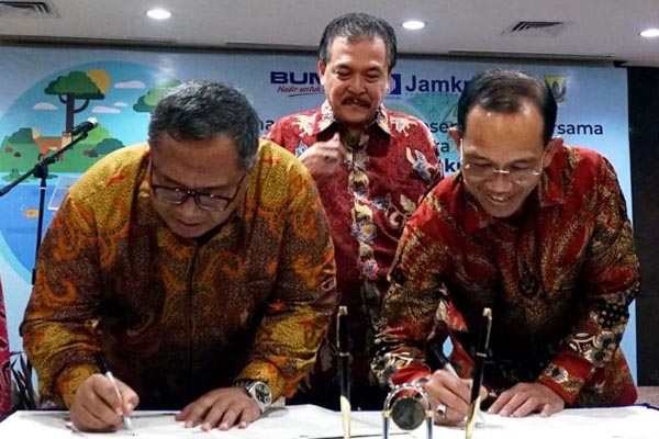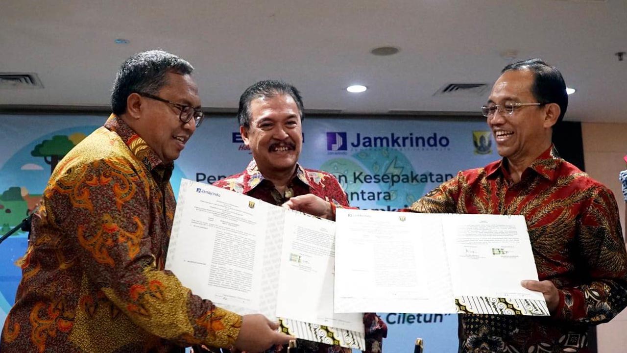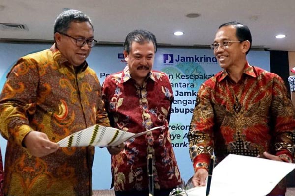 Direktur Utama Perum Jamkrindo Randi Anto (tengah) bersama dengan Direktur MSDM, Umum, dan Kepatuhan Perum Jamkrindo Sulis Usdoko (kanan) dengan Bupati Sukabumi Marwan Hamami (kiri) tengah berbincang usai melakukan penandatanganan kesepakatan bersama antara Perum Jamkrindo dengan Pemerintah Kabupaten Sukabumi tentang peningkatan perekonomian masyarakat berbasis kampanye anti sampah plastik di Ciletuh Palabuhanratu Unesco Global Geopark, Jawa Barat, di Gedung Jamkrindo, Jakarta, Kamis 28 November 2019. Melalui serangkaian kegiatan yang dimulai dari peningkatan kesadaran masyarakat mengenai perlunya menangani sampah plastik, perekonomian masyarakat di kawasan Geopark Ciletuh Palabuhanratu, Kabupaten Sukabumi, Jawa Barat ini kegiatannya bersifat kolaboratif yang akan dilaksanakan selama tiga tahun ke depan untuk mendukung Indonesia Bebas Sampah Plastik 2025 yang dicanangkan oleh pemerintah.